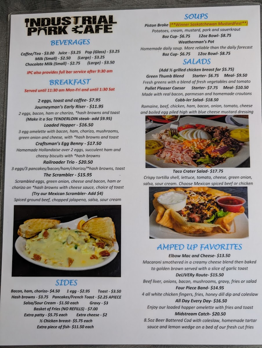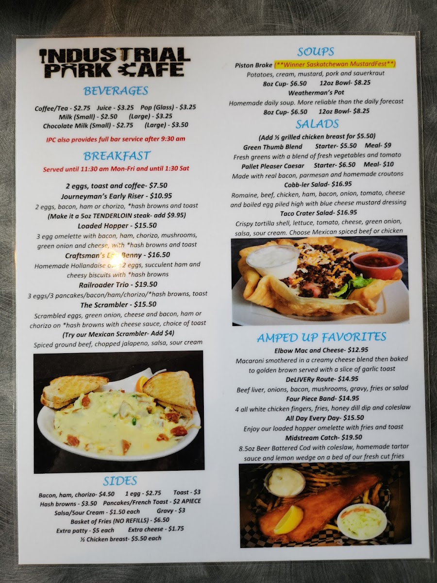 The Industrial Park Cafe Menu offers a delightful mix of comfort food and unique flavors that will leave you craving more. Located at 101 Hodsman Rd in Regina, this cozy spot serves up an inviting atmosphere and a menu that caters to everyone. Whether you're stopping by for a quick lunch or enjoying a relaxing dinner, there's something here for every taste.